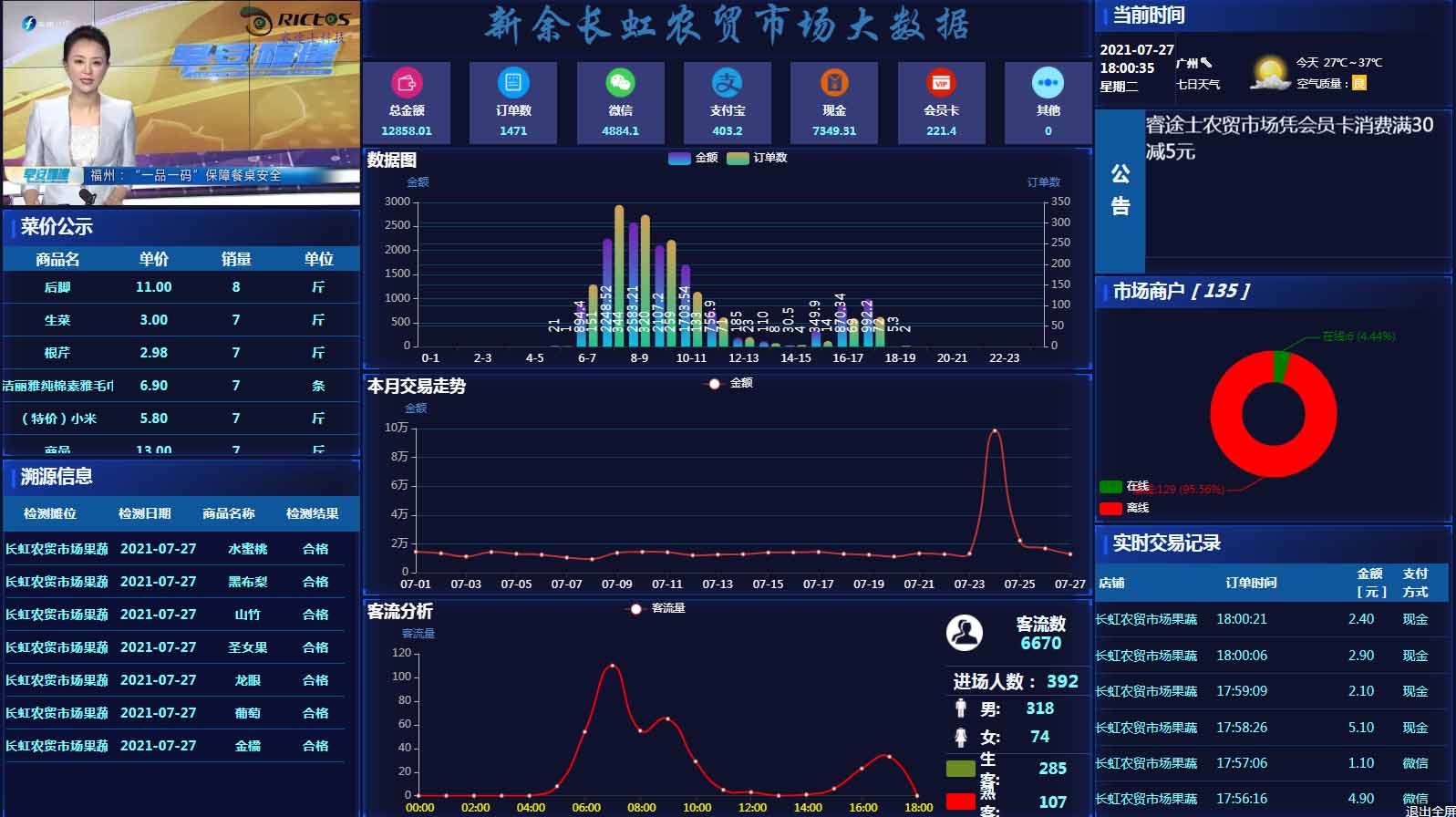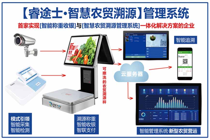 創(chuàng)新實(shí)現(xiàn)了【智慧農(nóng)貿(mào)溯源管理系統(tǒng)】與【智能稱重收銀】一體化解決方案,集市場管理、運(yùn)營管理、溯源追溯、智能收銀大數(shù)據(jù)運(yùn)用于一體,硬件、軟件與管理系統(tǒng)完美結(jié)合。適用于農(nóng)批、農(nóng)貿(mào)市場蔬菜、生鮮、水果、水產(chǎn)、肉類、熟食等稱重和非稱重銷售;由于采用一體化設(shè)計(jì),解決了傳統(tǒng)農(nóng)貿(mào)市場無法實(shí)現(xiàn)的信息化、智能化、可追溯的管理問題;使稱重、收銀、追溯、管理、更透明、公正、安全,讓顧客無后顧之憂,給管理工作帶來極大的便捷與高效,對(duì)國內(nèi)農(nóng)產(chǎn)品行業(yè)的發(fā)展、農(nóng)產(chǎn)品流通管理起到了典范作用。 【睿途士首創(chuàng)】顛覆傳統(tǒng)的“智慧農(nóng)貿(mào)市場系統(tǒng)”,解決了傳統(tǒng)農(nóng)貿(mào)系統(tǒng)單一安卓掛屏,昂視不方便看、不直觀、無互動(dòng)性,傳輸信息不齊全、不穩(wěn)定的問題,也解決了按鍵電子秤商品難找、商品代碼難記、按鍵操作不靈活、支付不智能,對(duì)收銀管理、銷售商品、菜名、菜價(jià)、打折、優(yōu)惠、會(huì)員、線上下單、采購等無法實(shí)現(xiàn)實(shí)際菜品交易和追溯等問題。 更具顛覆性的是睿途士智慧系統(tǒng)擁有三大管理平臺(tái)(市場管理平臺(tái)、總部運(yùn)營管理平臺(tái)、商戶后臺(tái)管理平臺(tái))、一個(gè)可視操作前臺(tái)和三大追溯功能,讓遠(yuǎn)程管理、數(shù)據(jù)傳輸、人機(jī)互動(dòng)、智能控制、移動(dòng)支付、大數(shù)據(jù)、互聯(lián)通信、云端存儲(chǔ)、人工智能、智能城市、電子定位、智能收銀等功能得以實(shí)現(xiàn)。