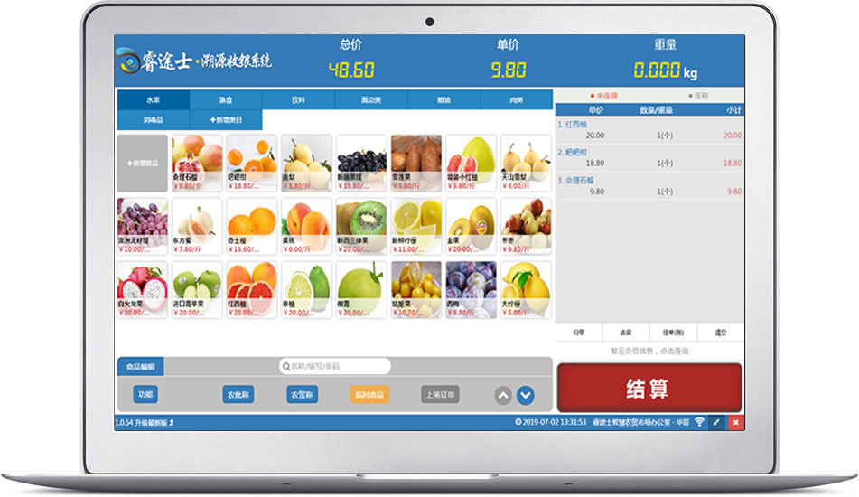 稱重、收銀、打印、掃描一體化,點(diǎn)擊商品圖標(biāo)就是稱重,告別傳統(tǒng)打條碼模式,所有商品稱重完成后,自動(dòng)計(jì)算總價(jià),點(diǎn)擊收銀即完成整個(gè)過(guò)程。